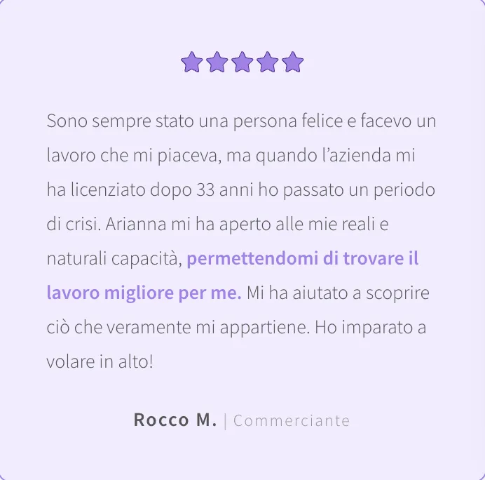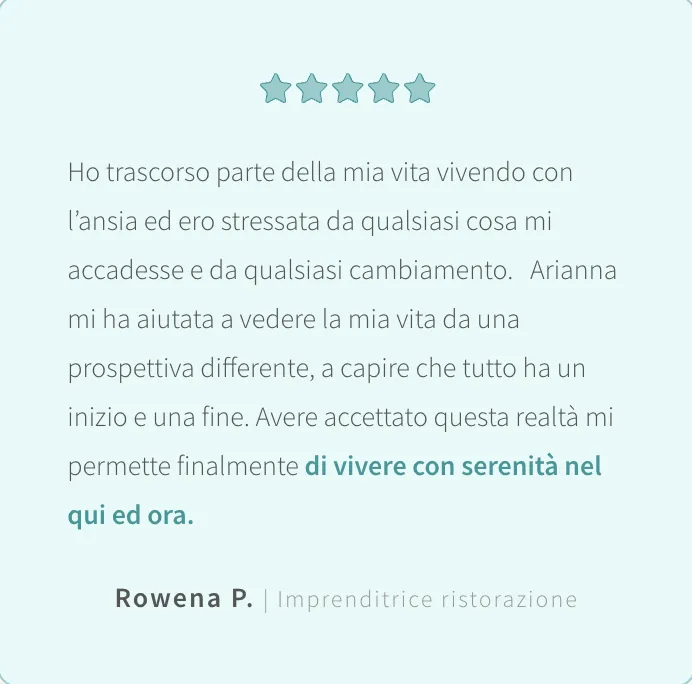 Dopo un lungo percorso tra pratiche olistiche, naturopatia, discipline energetiche, PNL e ipnosi — che nel 2014 ha rappresentato la sua vera svolta — Arianna ha scelto di dedicarsi a chi desidera liberarsi da pesi interiori e schemi ripetitivi.